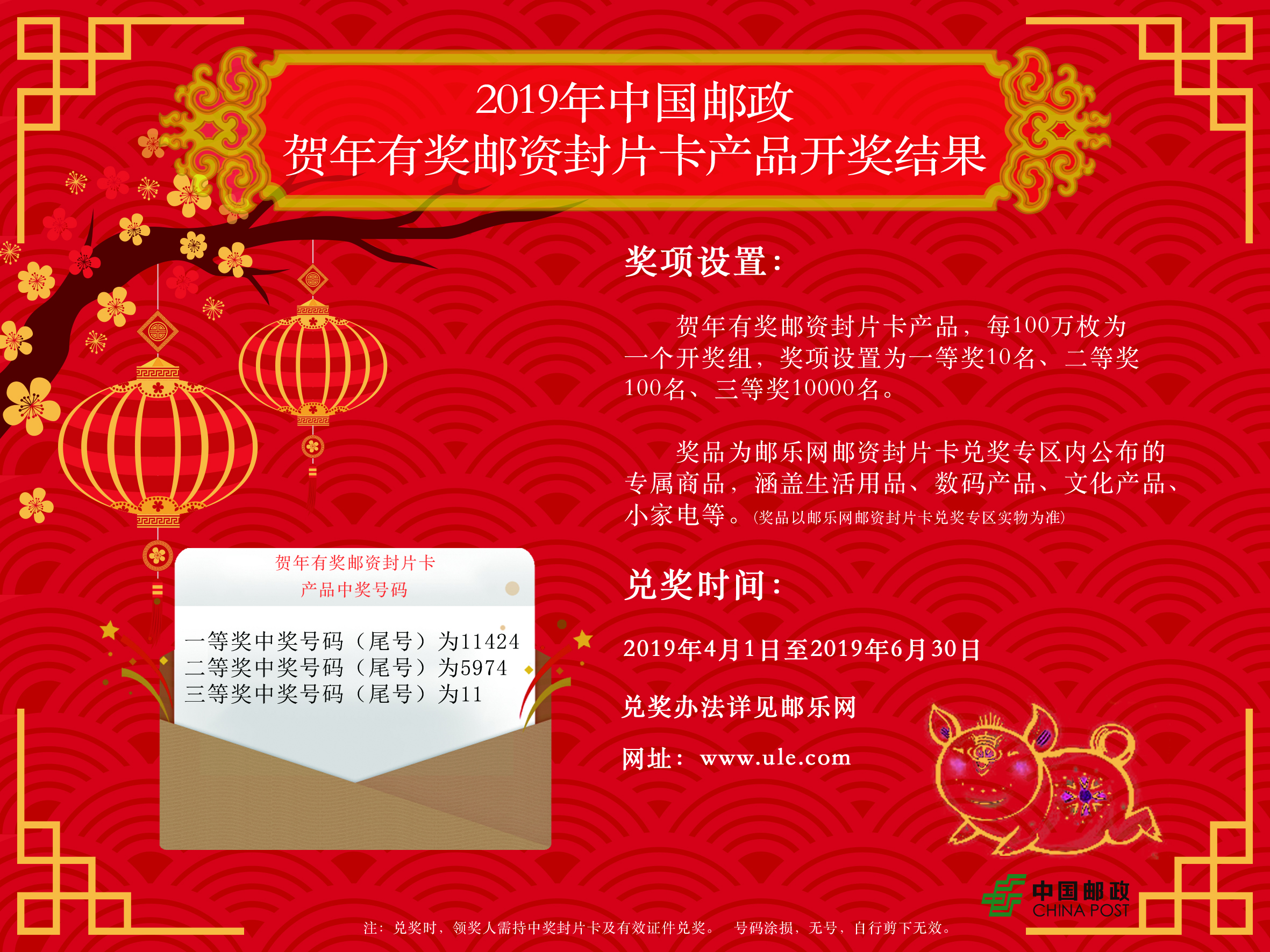 賀年有獎(jiǎng)郵資封片卡產(chǎn)品,每100萬(wàn)枚為一個(gè)開(kāi)獎(jiǎng)組,獎(jiǎng)項(xiàng)設(shè)置為一等獎(jiǎng)10名、二等獎(jiǎng)100名、三等獎(jiǎng)10000名。